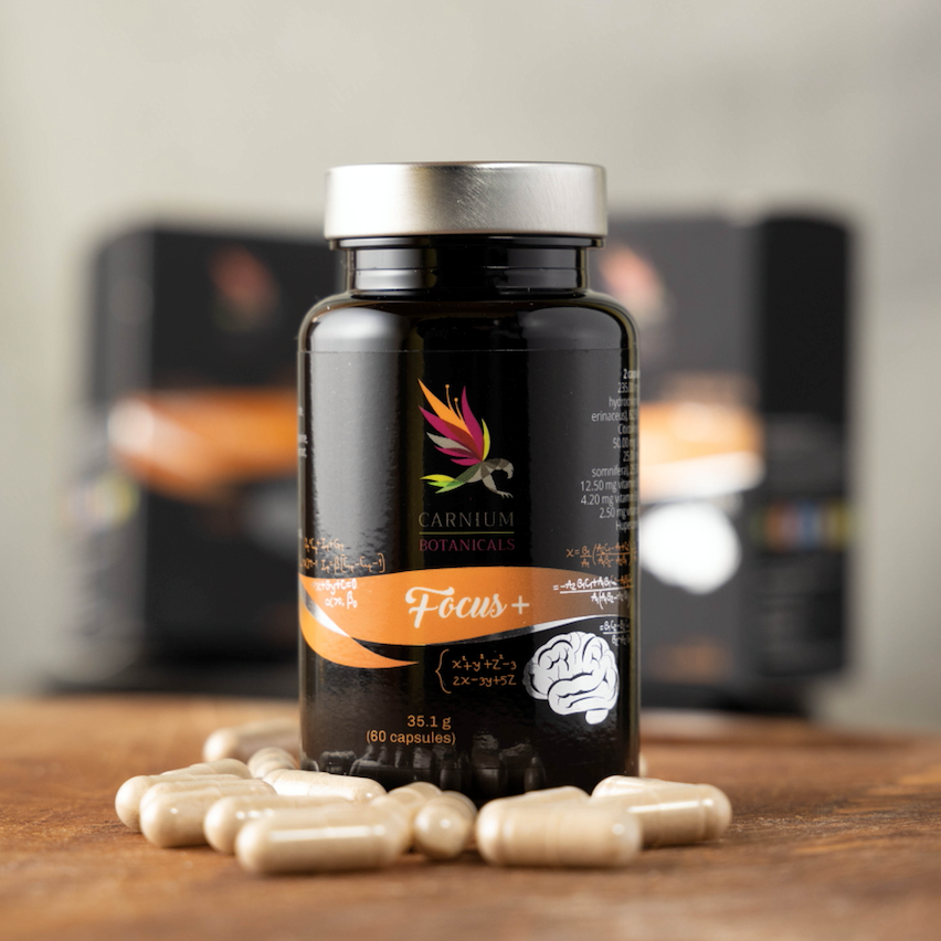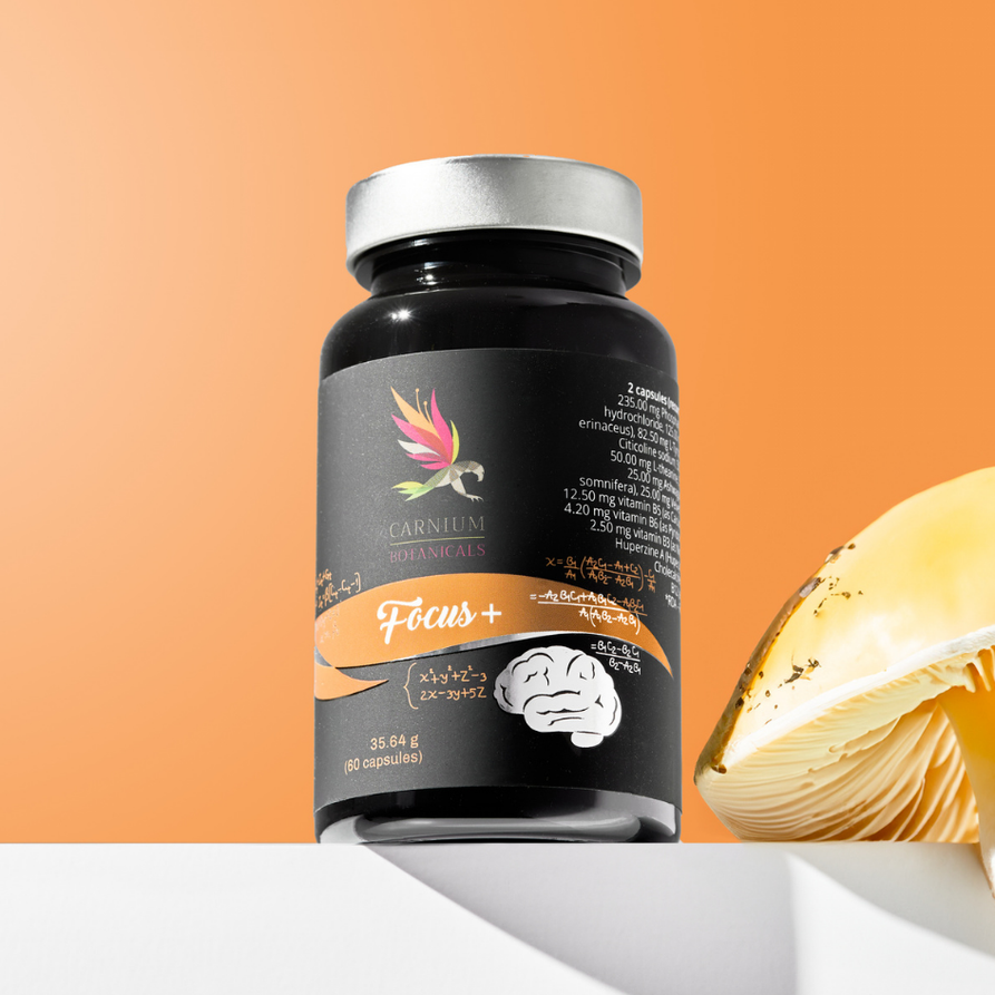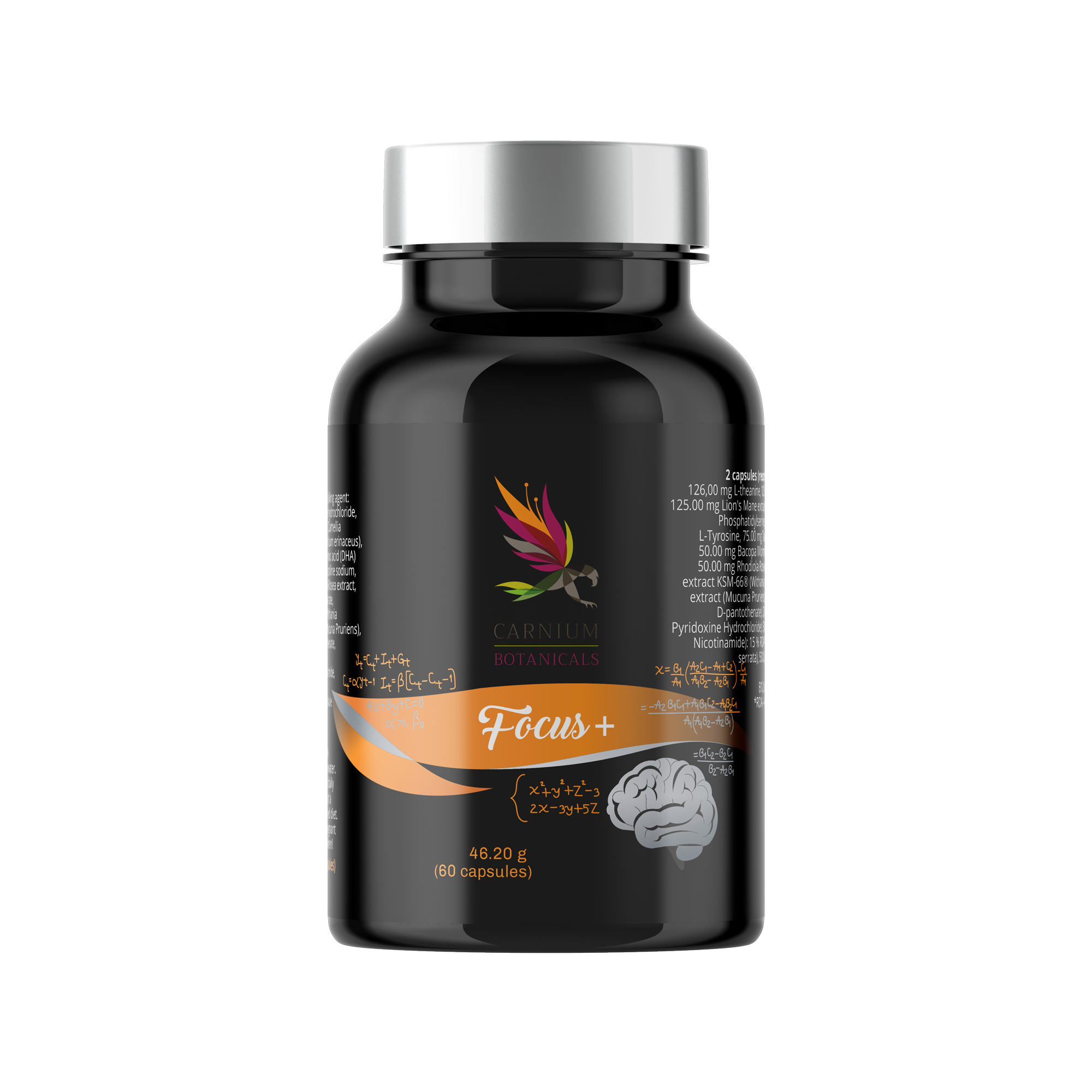 Focus+ es un complemento alimenticio basado en ingredientes naturales y nootrópicos seguros y comprobados que ayudan a apoyar la función cerebral y aumentar las capacidades cognitivas. Entre sus componentes se incluyen fosfatidilserina, L-carnitina, hongo de barba frangiada, L-tirosina, aminoácido taurina, citicolina, L-teanina, extracto de hierba Brahmi, extracto de raíz de rosa, ashwagandha, extracto de frijol de terciopelo, vitaminas B3, B5, B6, SI12, RE3, y uperzina A.