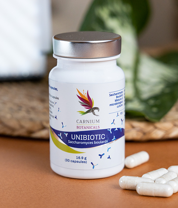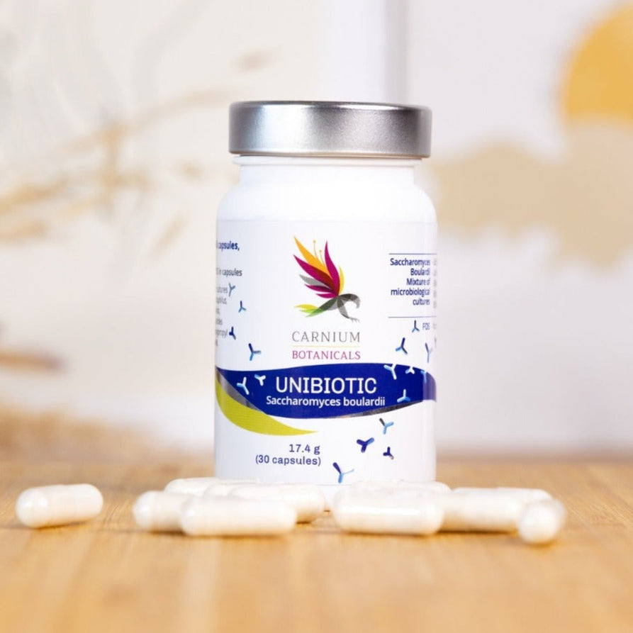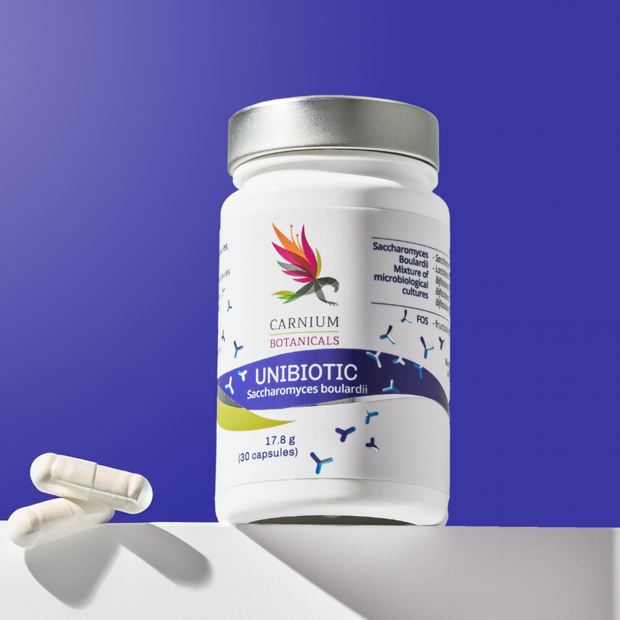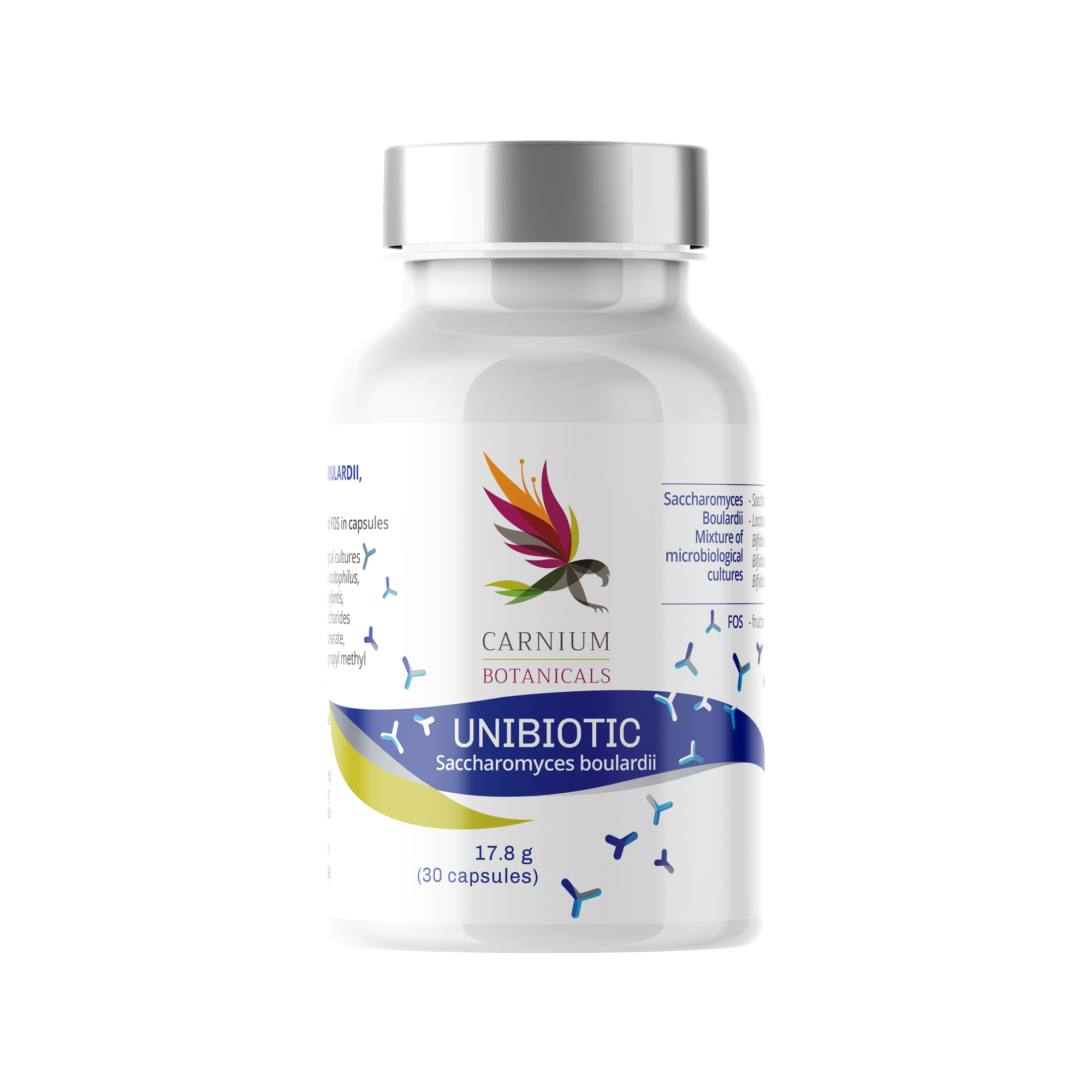 Unibiotic Saccharomyces Boulardii de Carnium Botanicals es una fórmula avanzada que combina cultivos probióticos de alta calidad, frutooligosacáridos FS2-60 (prebióticos) e inulina vegetal, diseñada para promover el equilibrio óptimo de la microbiota intestinal.